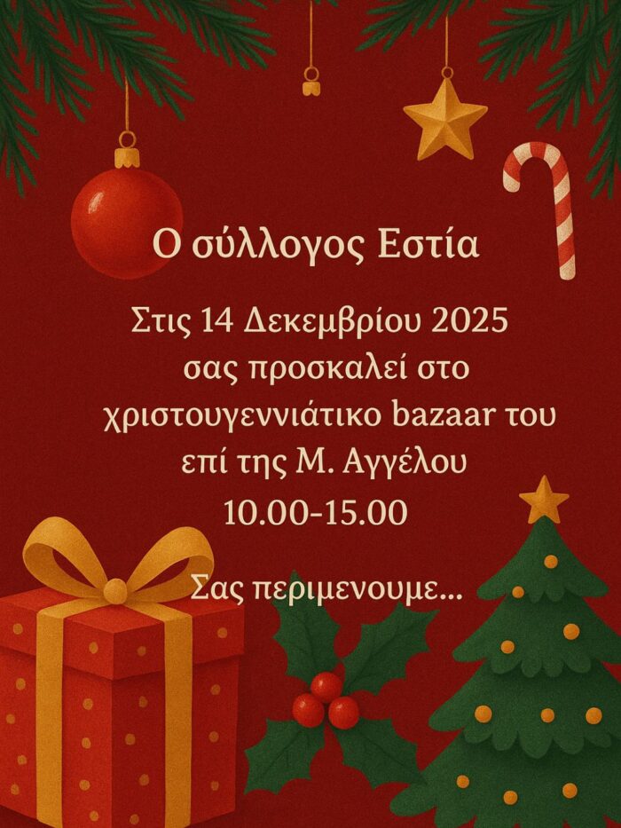Σύλλογος ΕΣΤΙΑ – ΧΡΙΣΤΟΥΓΕΝΝΙΑΤΙΚΟ BAZAAR 2025 11 Δεκεμβρίου, 2025 admin Δείτε τη συλλογή μας, Σας περιμένουμε….
